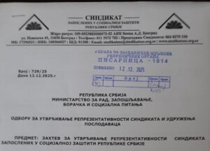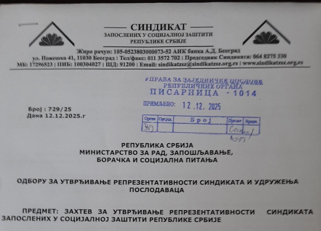 Синдикат запослених у социјалној заштити је дана 12.12.2025. године поднео надлежном органу захтев за утврђивање репрезентативности.